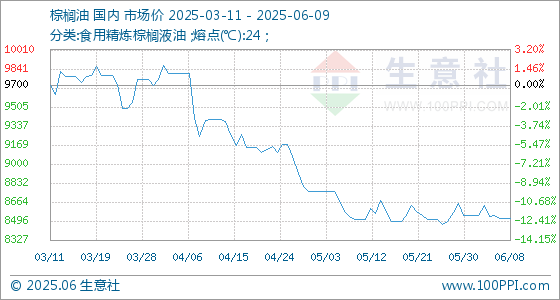 6月9日生意社棕榈油基准价为8520.00元/吨
