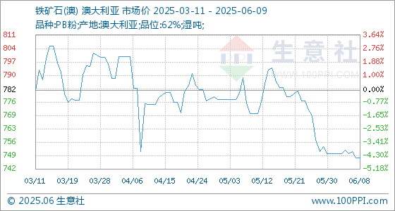 6月9日生意社铁矿石(澳)基准价为748.11元/吨