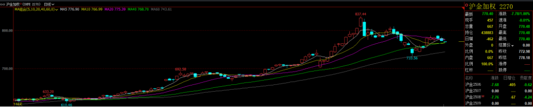 沪金期货2508主力合约周二继续回落,开盘价777.90元/克,最高价780.98元/克,最低价770.38元/克,最终收盘在771.60元/克,全天下跌5.70元/克,跌幅0.73%。金价继续回落。