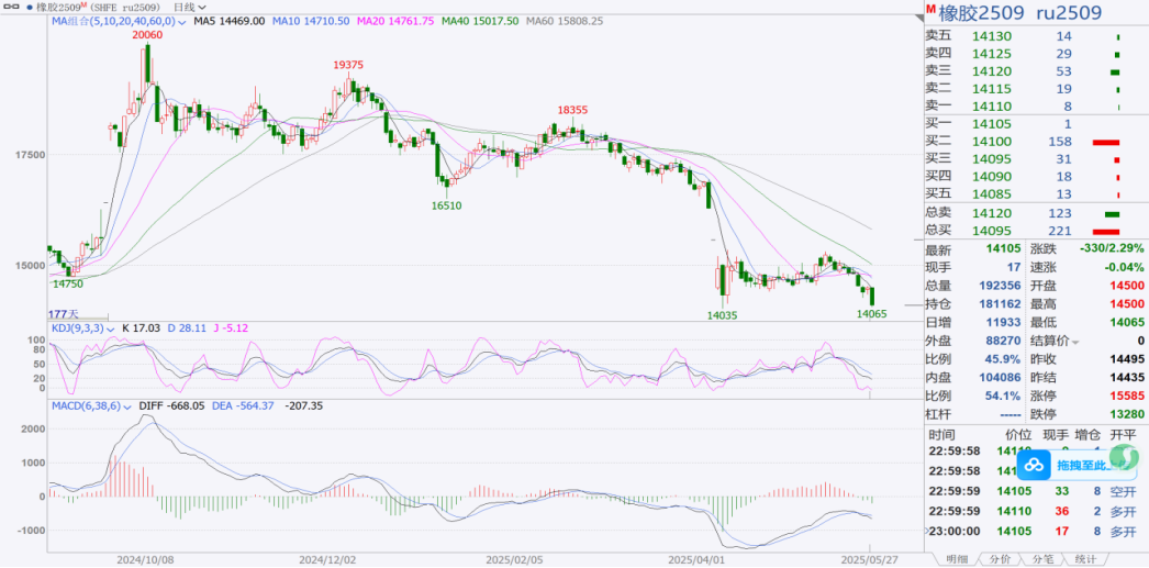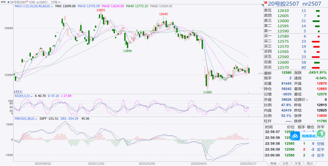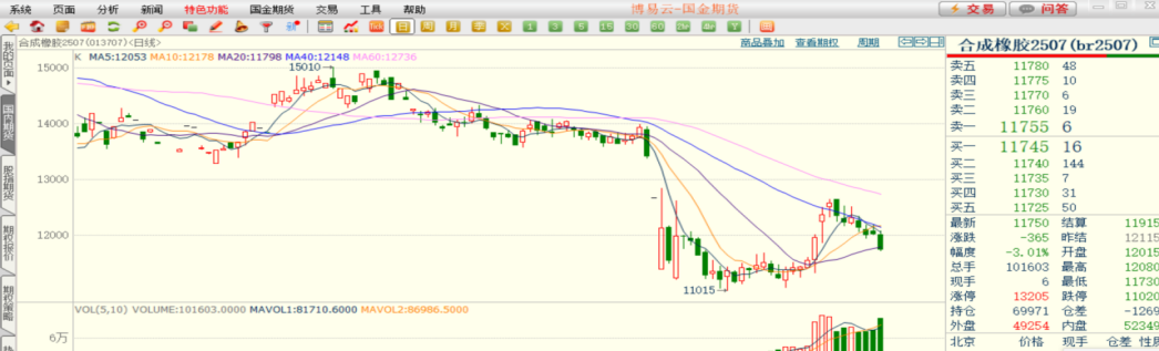 今日合成橡胶主力合约BR2507开盘价11595元/吨,最高11645元/吨,最低11520元/吨,收盘11645元/吨。