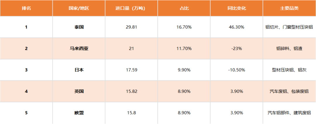 根据海关总署及行业报告数据,2024年中国废铝进口量约178-180万吨,前五大来源国为泰国、马来西亚、日本、英国、欧盟。2024年10月21日生态环境部联合海关总署、国家市场监督管理总局等六部门联合更新发布了第23号公告《关于规范再生铜及铜合金原料、再生铝及铝合金原料进口管理有关事项的公告》。公告里表示从2024年11月15日我国进口废铝新政开始落地执行,新政放宽进口废铝品类,新增了再生变形铝合金和再生纯铝原料类别。由于我国对东南亚国家进口铝合金有政策优惠倾斜,随着国内对进口废铝标准要求提高后,欧美地区的出口固体废料也多从东南亚国家中转贸易。