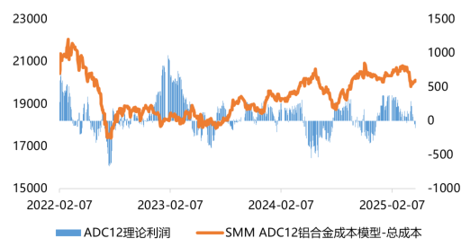 2)再生铝产业链中游——再生铝合金生产。再生铝合金以废铝为核心原料,通过原料分选处理、熔炼合金化、精炼净化及铸造成型四大核心工序完成。据SMM数据,2024年全国再生铸造铝合金产能达1762万吨,全年产量705万吨,同比增长2.8%;新投产能快速扩张(2024年计划新增28个项目),叠加进口废铝关税增加(新政后税率1.5%),企业毛利率被压缩至12%以下,行业产能过剩问题突出,实际产能利用率不足四成。随着国家政策向低碳产业倾斜,未来铸造再生铝合金在汽车、电子等领域的应用将持续拓展,冗余产能利用率有望提升,产量将显著增长。其中,以上期所拟上市的国标383Y.3号及日标ADC12号为代表的再生铸造铝合金将成为市场需求的主力军。