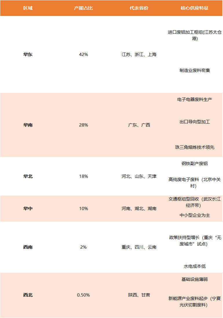 1)再生铝产业链上游——回收废铝料。废铝是再生铝合金的原料来源,废铝供应可分为新料和旧料,新料为铝材加工铸造环节产生的工艺废铝,废铝旧料是指下游终端应用寿命结束后回收的废铝料子,由于废铝新料更多直接由冶炼端回炉,市场上流通的废铝多为旧料,国内建筑废铝、汽车废铝占废铝供应的主流,食品包装如铝罐等因保有量较低及转化技术限制导致回收率低。市场废铝供应有国产料及进口料,2024年国产废铝旧料回收量约在1279万吨,占废铝供应量的68%,新废铝产量600万吨,随着电解铝消费量增长同步走增,按照地域来看,国内废铝供应主要来自华东地区(占比超40%)、西南地区(占比25%)、华北地区(占比18%)、华中地区(占比12%)、华南地区(占比8%)。