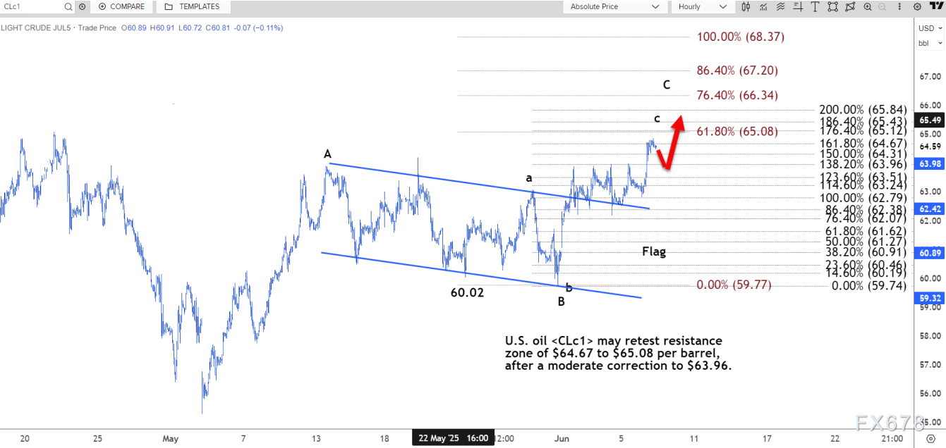 路透技术分析师指出,美国原油在温和回调至 63.96 美元/桶后,可能重新测试 64.67 美元至 65.08 美元/桶的阻力位。