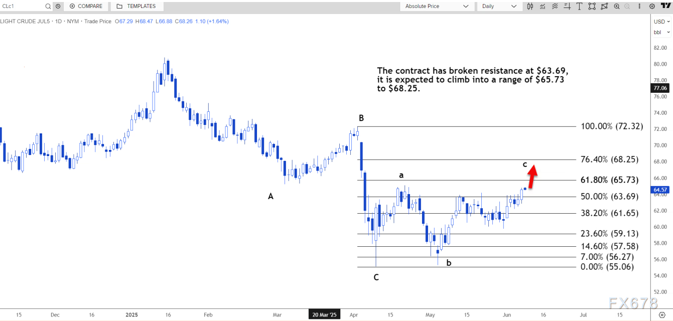 日线图上,该合约已突破63.69美元的阻力位,预计将攀升至65.73美元至68.25美元的区间。