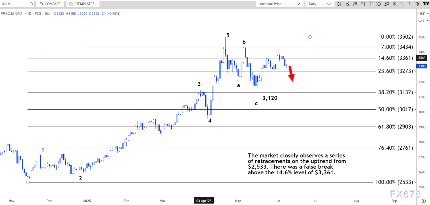 日线图上,市场密切关注自 2533 美元以来的一系列上涨趋势回撤。在 3361 美元的 14.6% 水平上方出现了一次假突破。