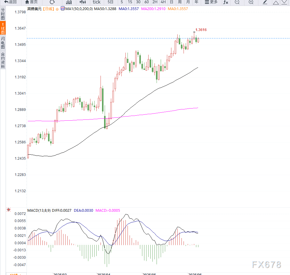 上行方面,首个关键阻力位于1.3650,为布林带上轨。若有效突破,可能进一步上探1.3748(2022年1月13日高点),更上方目标见1.3834(2021年10月20日高点)。