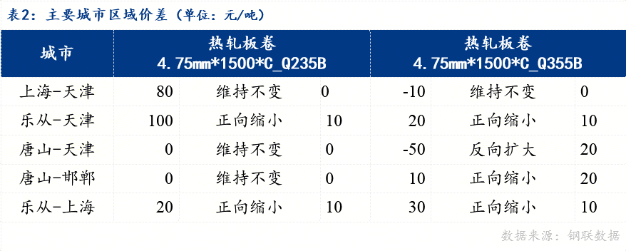 从区域价差来看,4.75mm普卷华南与华北价差100元/吨,华东与华北价差80元/吨,华南与华东价差20元/吨。京津冀地区价差来看,唐山与天津价差0元/吨,唐山与邯郸价差0元/吨。