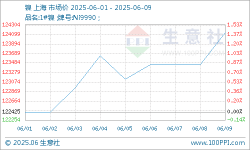 据生意社商品行情分析系统监测,6月9日,现货电解镍报124133元/吨,周涨幅1.40%,呈震荡上行趋势。印尼内贸镍矿基准价坚挺,矿端贴水持稳,下行空间有限。