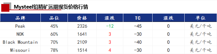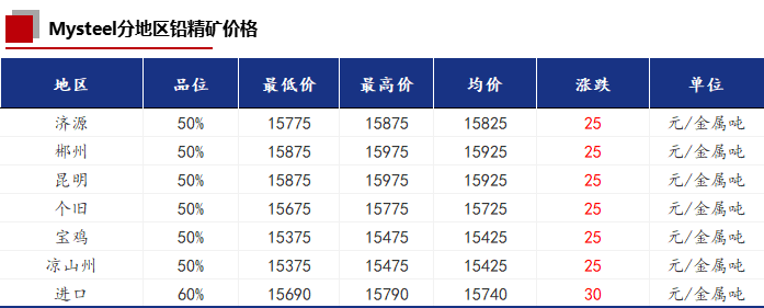 今日受铅价的影响,铅精矿价格较上一交易日上涨25元/金属吨。国内铅精矿加工费各地区均未调整,和上一交易日持平。进口铅精矿价格涨30元/金属吨。