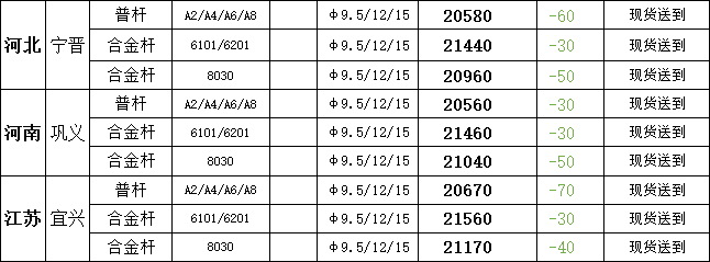 6月9日宁晋市场普铝杆现货报盘价20580元/吨,较上一交易日报价跌60元/吨;巩义市场普铝杆现货报盘价20560元/吨,较上一交易日报价跌30元/吨;宜兴市场普铝杆报盘价20670元/吨,较上一交易日报价跌70元/吨。