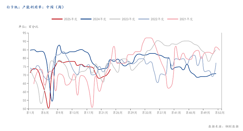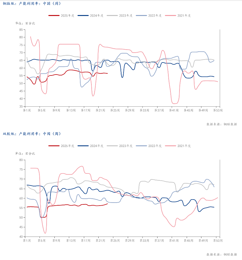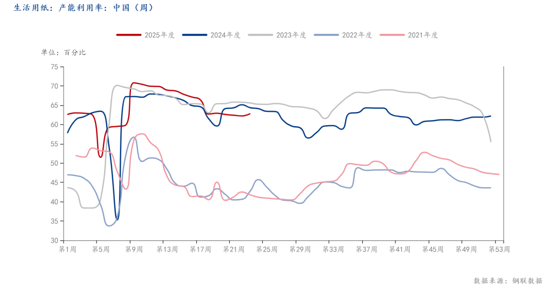 (2)需求方面,至6日,铜版纸产能利用率环比降0.56%,双胶纸产能利用率环比增0.7%,节假日停工停产企业暂未恢复生产,秋季出版订单暂未集中供货,文化用纸整体相对偏弱。生活用纸开工率环比上周涨0.58%,部分停工检修企业暂未恢复生产。618促销活动暂未显著刺激消费者需求,生活用纸保持平稳运行。白卡纸开工率环比增3.41%,有边际好转,但同比处于低位水平。