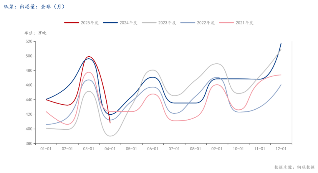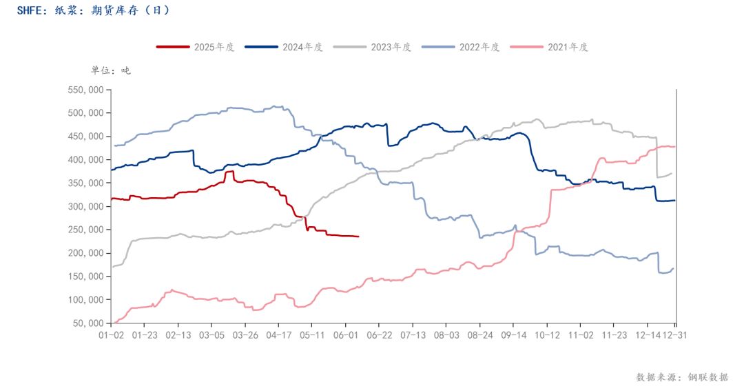 (1)供应方面,钢联数据显示,4月全球出港量407.7万吨,环比减少99万吨,同比处于低位水平,预计6月国内纸浆到港量减少,对浆价有一定支撑。不过,海关总署6月9日发布数据显示,中国5月纸浆进口量为301.6万吨(4月进口量289.3万吨),1-5月累计进口量1554.7万吨,同比增2.1%,整体供应相对宽松。
