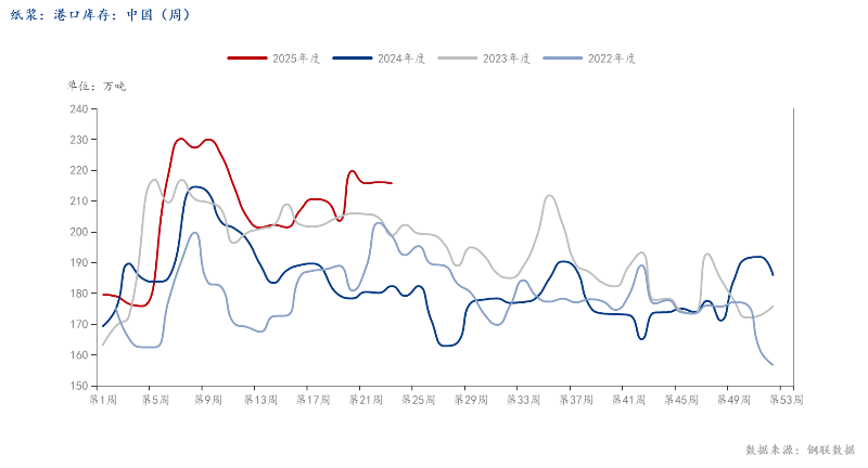 (3)库存方面,至6月5日,国内港口样本库存215.7万吨,环比下降0.2%,同比仍在历史高位。期货库存23.5万吨,同比处于低位。总库存仍维持年内高位水平,浆价上行有压力。