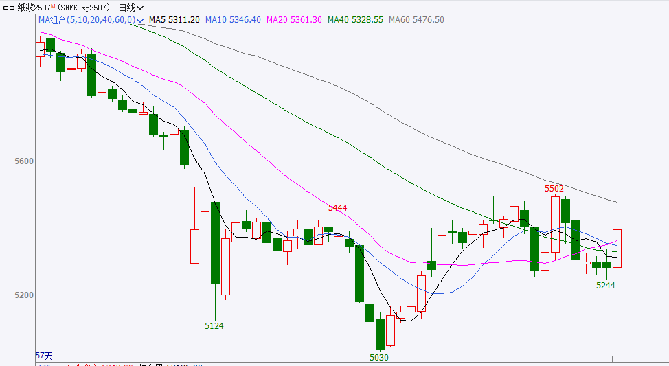 市纸浆主力合约今日偏强运行,午后突破5400关口,最终收盘5394,收涨2.08%。