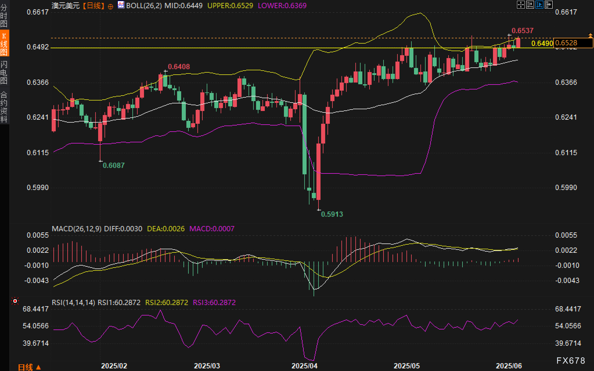美国方面,5月非农就业新增13.9万人,虽不及前值,但高于预期;失业率维持在4.2%,薪资增长稳定于3.9%,强劲就业数据短期支撑美元。然而,财政赤字扩大及“Sell America”情绪蔓延,削弱了美元多头基础。美国财政与货币政策分歧、政局因素干扰,亦增加市场波动性,为澳元上行创造条件。