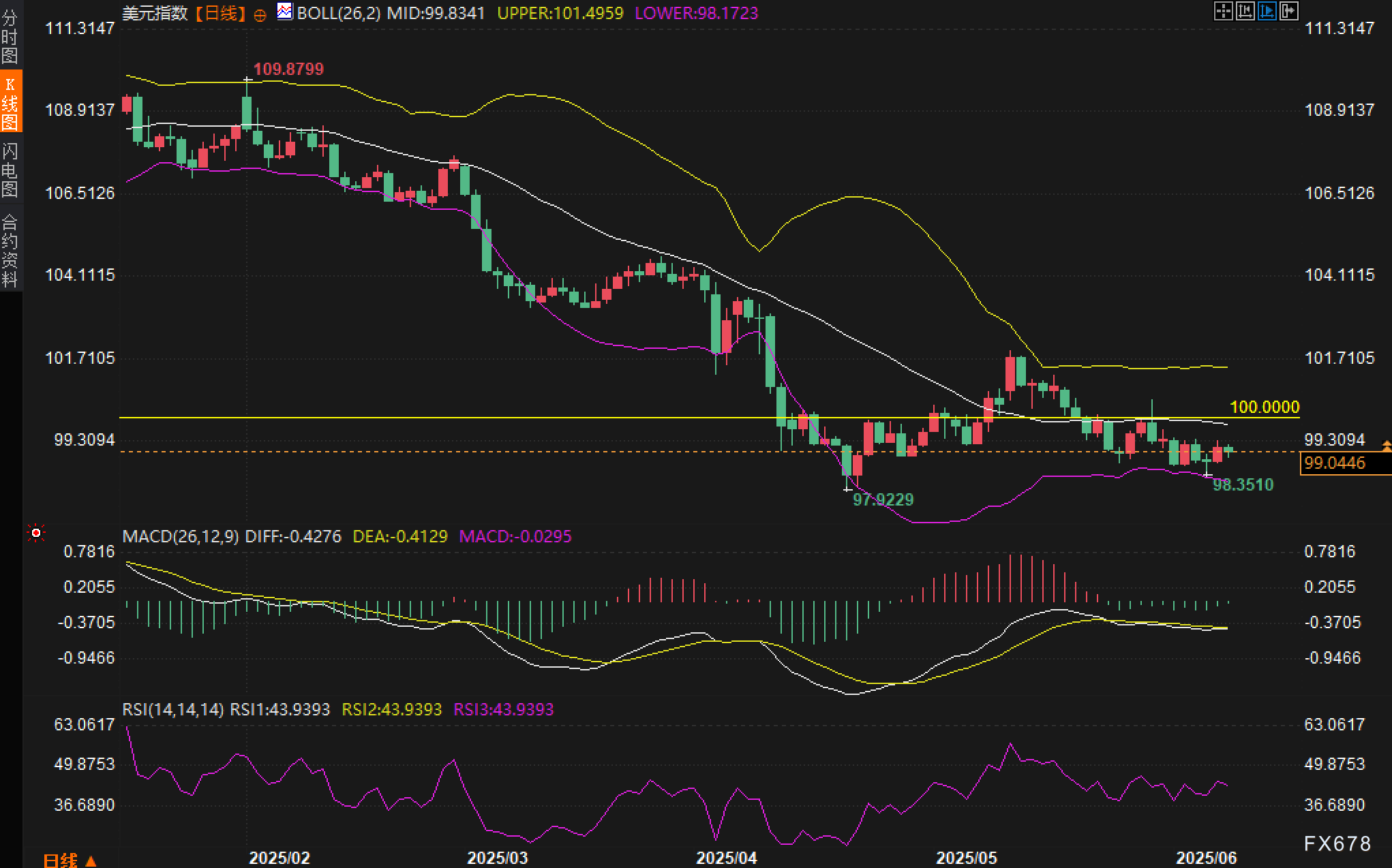 当前美元指数日线图显示,汇价维持低位整理,短期趋势偏弱但略显企稳迹象。K线连续多日收于布林中轨下方,整体呈现横盘趋势,尚未出现明确的方向性突破。