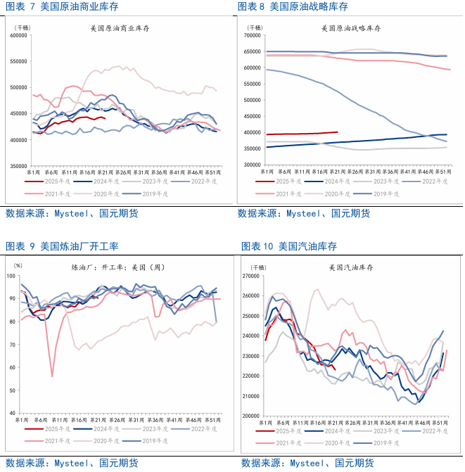 原油库存比去年同期低3.15%;比过去五年同期低6%;汽油库存比去年同期低2.52%;比过去五年同期低3%;馏份油库存比去年同期低13.31%,比过去五年同期低17%。