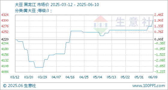 6月10日,生意社大豆基准价为4304.00元/吨,与本月初(4260.00元/吨)相比,上涨了1.03%。