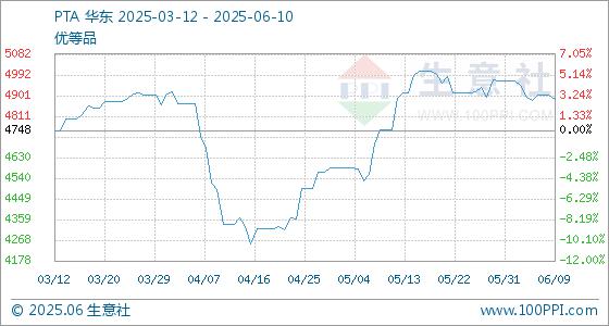 6月10日,生意社PTA基准价为4884.50元/吨,与本月初(4965.62元/吨)相比,下降了1.63%。