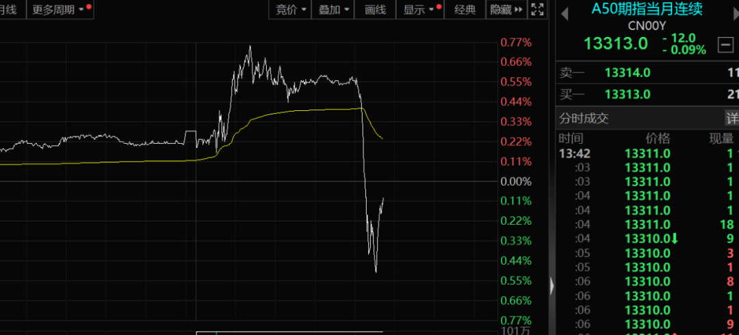 港股同时间也全线走弱,恒生科技指数跌幅扩大至1%。新消费股多数下跌,布鲁可跌约8%,古茗跌约6.5%,蜜雪集团跌约6%。A50也从高位直线滑落。不过,随后整个市场又都出现了一段非常显著的反弹。