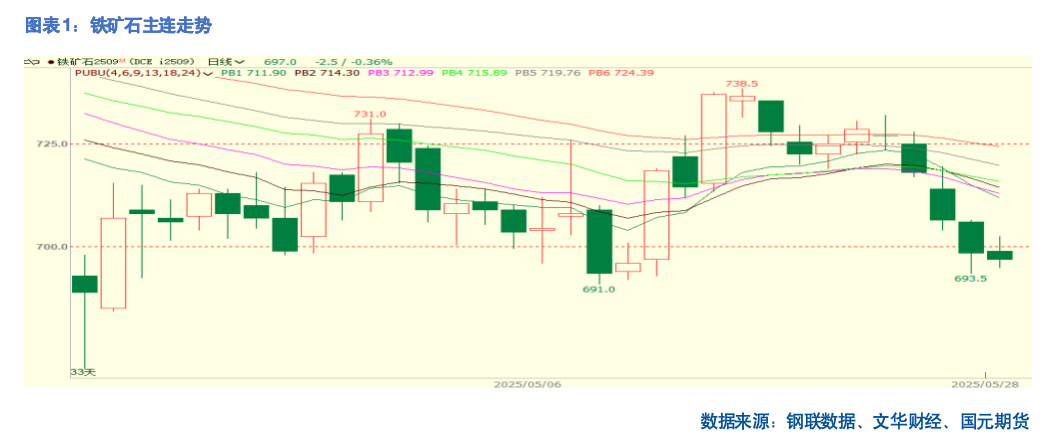 五月铁矿主力合约先扬后抑。5月10日至11日,在瑞士日内瓦举行中美经贸高层会谈中,中美双方大幅调低关税。大宗商品市场受到宏观提振,铁矿价格走强,铁矿09主力合约上探至738.5元/吨。下旬,市场情绪逐步消散,铁矿价格回归基本面。铁水连续两周下降,铁矿价格震荡偏弱,跌破700元/吨整数关口。