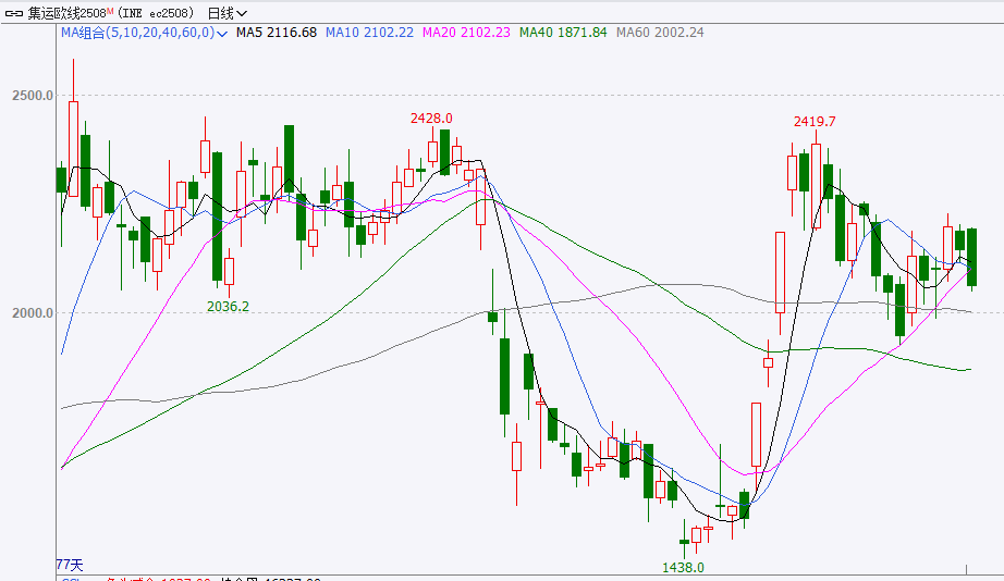 市场对于后续运价走势的预期呈现出分化态势,今日主力合约 EC2508 在午后明显走弱,最终收盘于 2062.5 点,跌幅达到了 4.35%。