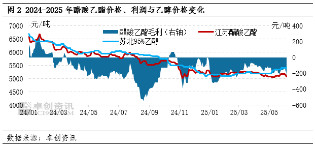 伴随乙醇价格上涨,下游成本压力增加,部分产品已经进入生产亏损状态。化工领域里占比最大的下游醋酸乙酯2025年表现不佳,终端需求时好时坏,醋酸乙酯价格窄幅震荡,相比2025年乙醇价格多数时间震荡上行,醋酸乙酯多数2025年以来持续处于生产亏损状态。从开工负荷率变化来看,醋酸乙酯虽有阶段性调整,但并无大的缩减。根据卓创资讯数据统计,2025年6月5日醋酸乙酯行业周度开工负荷率为56.7%,属于中等偏上水平,对乙醇的刚需持续。