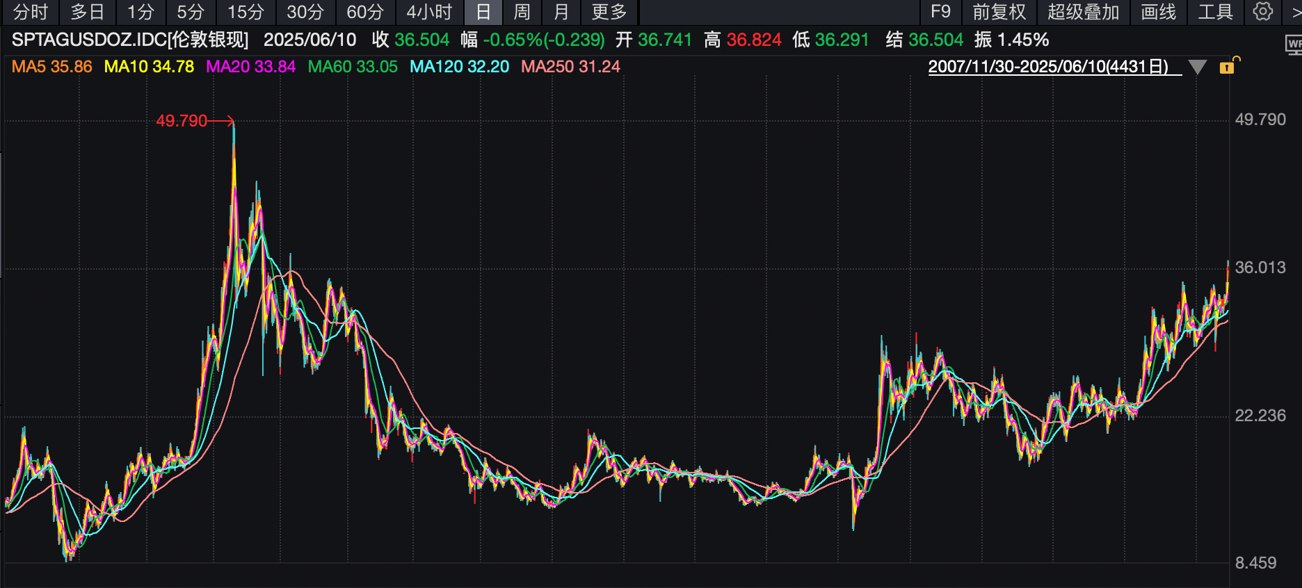 6月10日,白银震荡走跌,截至发稿现货白银报36.50美元/盎司,日内跌0.68%;COMEX白银期货报36.63美元/盎司,日内跌0.44%。