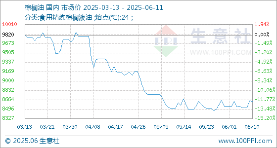 6月11日生意社棕榈油基准价为8630.00元/吨