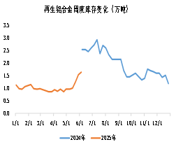 基本面方面,年全国再生铝合金产能达到1762万吨,产量约为704.5万吨,同比增长2.8%。其中年铝合金ADC12的产量约为465万吨,占比66%。受高产能、原料不足等因素制约,再生铝行业整体开工率长期处于低位。由于铝合金加工技术相对低壁垒,导致铝合金生产企业规模高,扩张速度快,利润偏低,再生铝合金行业存在产能过剩问题。2025年1-5月国内再生铝合金产量达285.3万吨,同比增长0.85%,截至目前再生铝合金年化产能为1777万吨。库存方面,当前再生铝合金周度社会库存仅1.64万吨,不管从产量还是库存看,价格下方均有一定支撑。