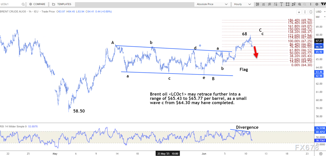 路透技术分析师指出,布伦特原油可能进一步回落至每桶 65.43 美元至 65.77 美元的区间,因为从 64.30 美元开始的小浪 c 可能已经完成。