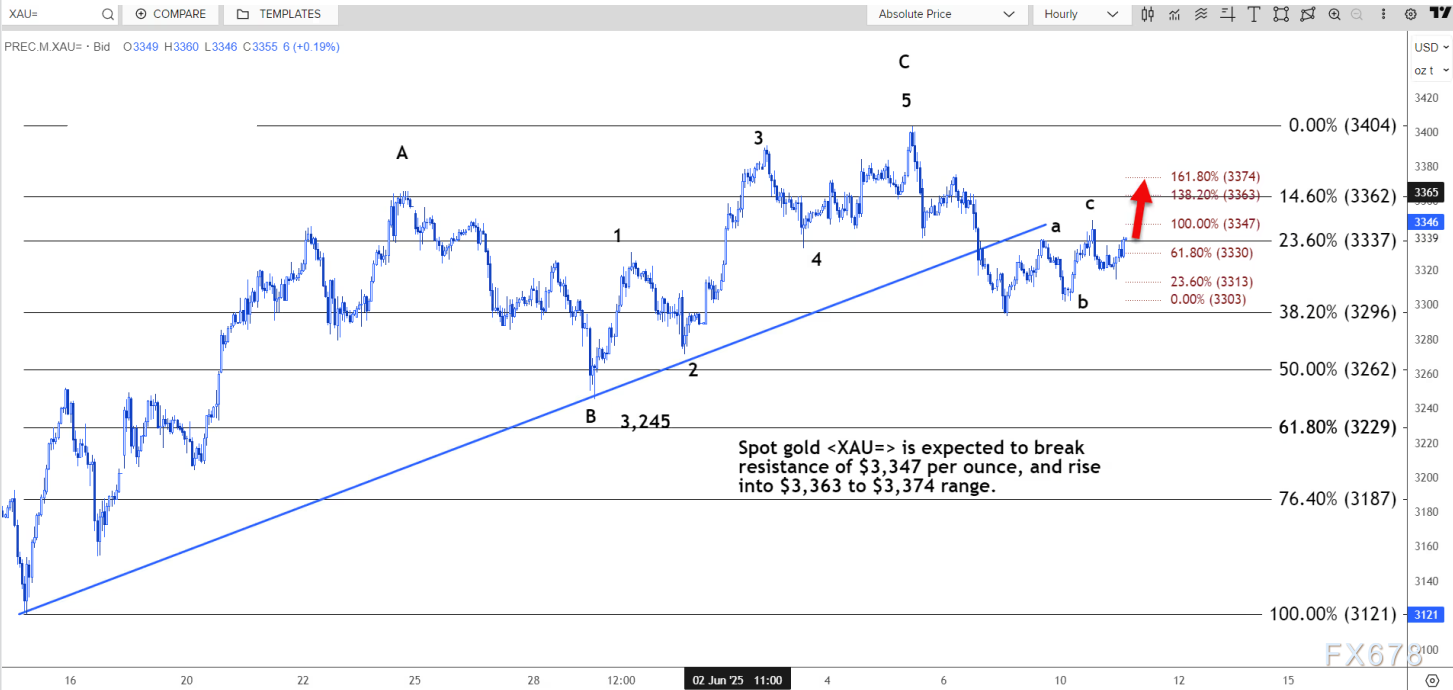 路透技术分析师指出,现货黄金预计将突破每盎司 3347 美元的阻力位,升至 3363 美元至 3374 美元的区间。