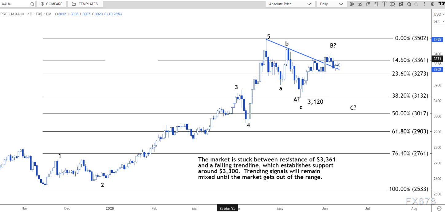 在日线图上,市场处于阻力位 3361 美元和下降趋势线之间,支撑位在 3300 美元左右。