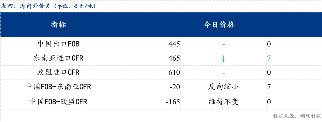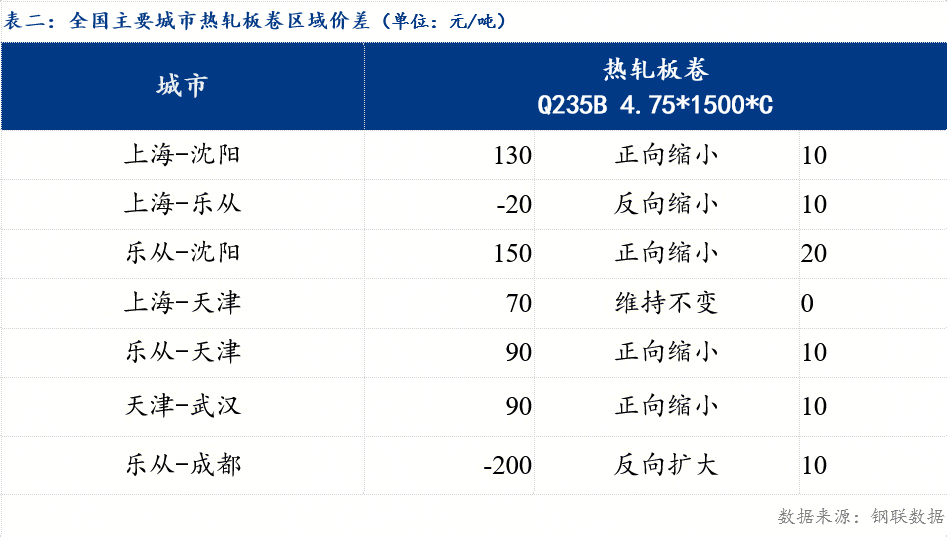 从区域价差来看,华东与东北价差130元/吨,较上一交易日正向上行10元/吨;华东与华南价差-20元/吨,较上一交易日反向缩小10元/吨;华南与华北价差为90元/吨,较上一交易日正向缩小10元/吨 。