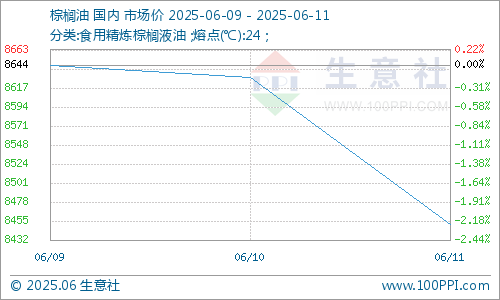 据生意社商品行情分析系统显示:本周利空仍在,国内棕榈油行情弱势下跌。6月9日,棕榈油市场均价8644元/吨,6月11日,棕榈油市场均价8452元/吨,价格下跌2.22%。