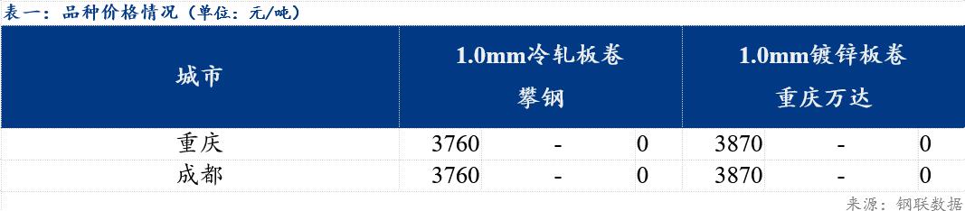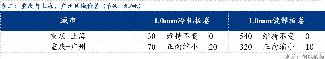 重庆、上海地区冷轧板卷区域价差维持不变;重庆、广州冷轧板卷区域价差缩小20元/吨。重庆、上海镀锌板卷区域价差维持不变;重庆、广州镀锌板卷区域价差缩小10元/吨。镀锌、冷轧品种价差维持不变;镀锌、热轧品种价差缩小10元/吨 ;冷轧、热轧品种价差缩小10元/吨。