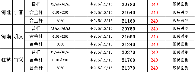 6月11日宁晋市场普铝杆现货报盘价20780元/吨,较上一交易日报价涨240元/吨;巩义市场普铝杆现货报盘价20760元/吨,较上一交易日报价涨240元/吨;宜兴市场普铝杆报盘价20870元/吨,较上一交易日报价涨40元/吨。