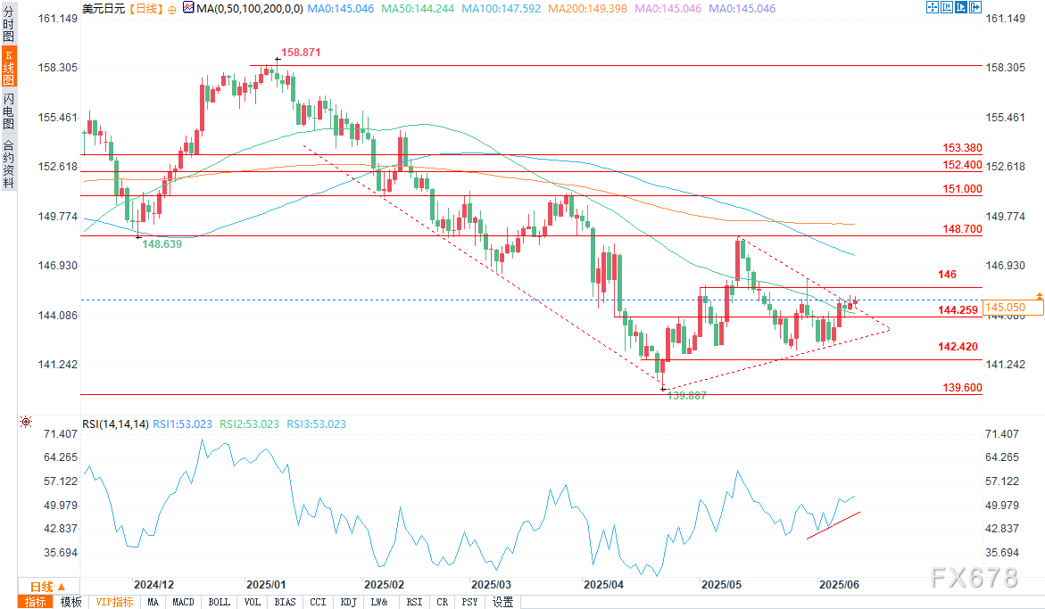 汇通财经APP讯——周三(6月11日),美元/日元当前价格在144.9-145.2区间波动,较开盘有一定上涨,突破部分短期阻力,但145.3附近存在前期压力。整体看,短期偏多但超买信号隐现。