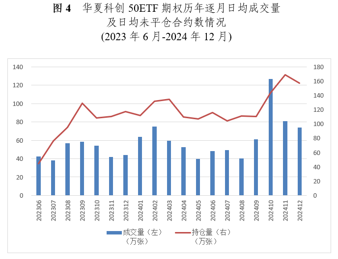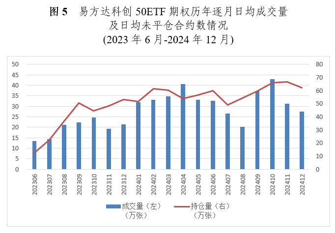 易方达科创50ETF期权合约累计成交0.78亿张,其中认购期权0.41亿张,认沽期权0.37亿张,日均成交32.32万张,单日最大成交88.93万张。年底持仓48.69万张,日均持仓58.14万张,单日最大持仓77.00万张。累计成交面值0.64万亿元,日均成交面值26.55亿元,累计权利金成交212.40亿元,日均权利金成交0.88亿元。