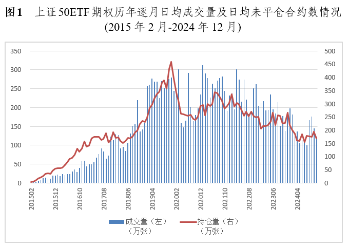 上证50ETF期权合约全年累计成交3.36亿张,其中认购期权1.81亿张,认沽期权1.55亿张,日均成交138.96万张,单日最大成交444.86万张。年底持仓130.28万张,日均持仓179.36万张,单日最大持仓254.32万张。累计成交面值8.50万亿元,日均成交面值351.12亿元,累计权利金成交1370.36亿元,日均权利金成交5.66亿元。