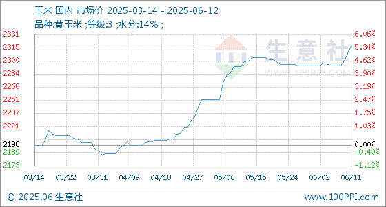 6月12日,生意社玉米基准价为2318.57元/吨,与本月初(2294.29元/吨)相比,上涨了1.06%。