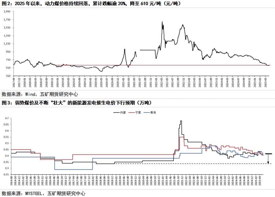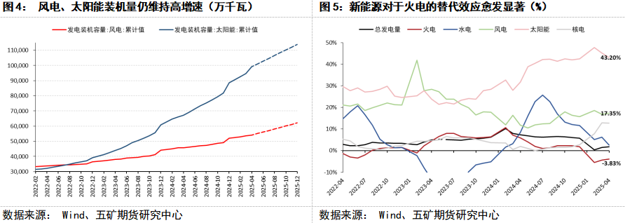 另外,新能源发电的持续发力使得风、光发电对火电替代效应愈发显著。2025年1-4月在总发电增长1.74%的背景下,火电增速却录得-3.83%。这对煤炭需求也形成明显制约,进一步强化弱势煤价以及火电价格下移的预期。