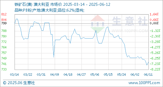 6月12日生意社铁矿石(澳)基准价为744.22元/吨