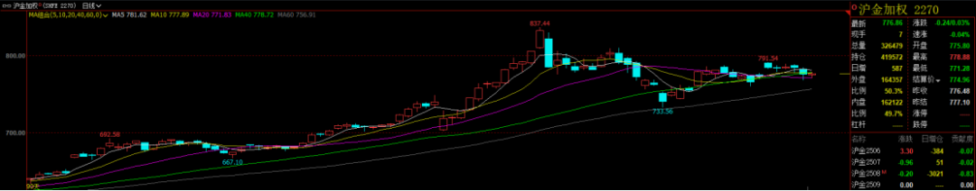 周一COMEX黄金期货维持震荡,沪金期货2508主力合约周二窄幅震荡,开盘价774.00元/克,最高价777.16元/克,最低价769.42元/克,最终收盘在775.06元/克,全天上涨0.34元/克,涨幅0.04%。