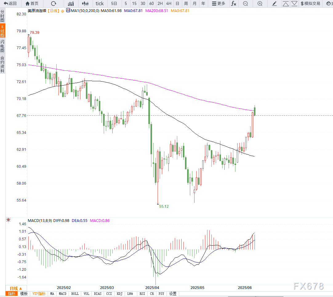 从日线图形来看,WTI原油自4月初低点以来呈现稳步上升趋势,当前价格已经突破此前的关键阻力位67.80美元一线。技术指标方面,短期均线(如5日与10日均线)形成金叉,显示短线动能持续增强;