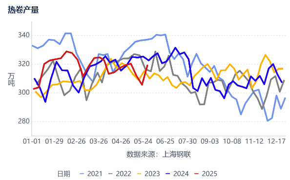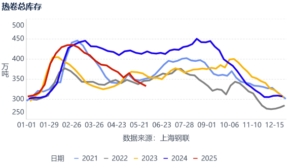 当前热卷供需水平均处于高位,库存也随之而持续下降。根据上海钢联的调研,目前热卷总库存降至332.8万吨,环比4月底下降35万吨,同比下降86万吨。随着库存的持续下降,库存压力也随之而持续缓解,库存对价格的支撑作用则随之而逐步增强。
