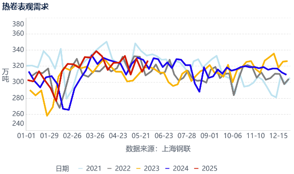 从热卷实际需求的表现来看,也验证了宏观政策对实体经济改善所带来的积极效果。根据上海钢联调研数据:当前热卷周度表观需求稳定在327万吨的高位水平,同比呈现改善回升的状态。随着“两新两重”政策的持续推进,制造业有望保持复苏之势。在此环境下,热卷需求亦有望保持持续改善的状态。