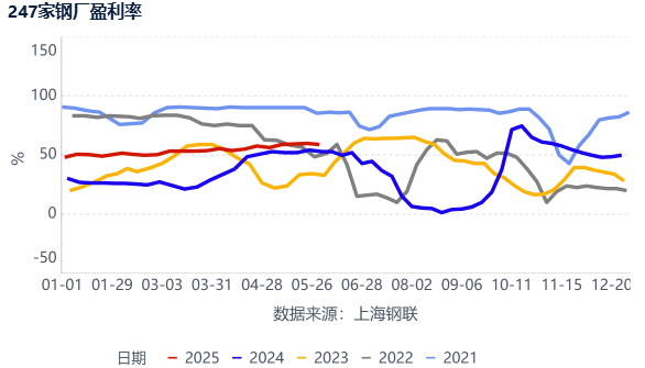 当前,钢厂盈利状况有所改善,生产意愿随之而有所提升。受此影响,钢厂铁水产量虽然环比有所下滑,但同比仍处于历史高位水平。根据上海钢联的调研数据:目前247家钢厂盈利率回升至58.9%,环比4月底上升2.6个百分点,较之于去年同期高出6个百分点。