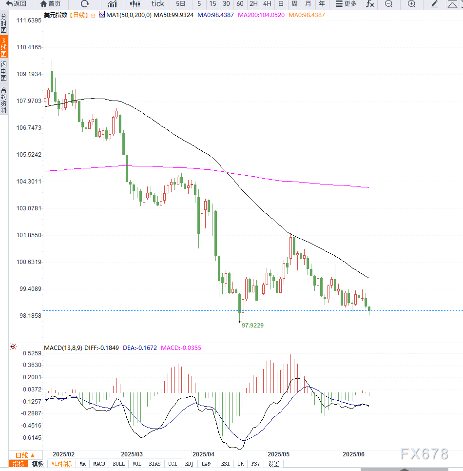 若美元指数反弹,短线初步阻力位于99.38(6月10日高点),突破后才有望上测100.00整数关口,进一步阻力在100.60附近布林带上轨区域。整体而言,只有重新站稳100关口上方,美元中期技术面才有望扭转弱势格局。